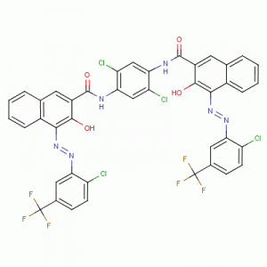 Engelsk alias: Pigment rød 242; PR242; Sandorin Scarlet 4RF; 2-naphthalencarboxamid, N,N'-(2,5-dichlor-1,4-phenylen)bis-[4-[[2-chlor-5-(trifluormethyl)phenyl]azo]-3-hydroxy-3-hydroxy -; (4Z, 4'E)-N,N'-(2,5-dichlorbenzen-1,4-diyl)bis(4-{[2-chlor-5-(trifluormethyl)phenyl]hydrazono}-3-oxo- 3,4-dihydronaphthalen-2-carboxamid); 4-[2-chlor-5-(trifluormethyl)phenyl]azo-N-[2,5-dichlor-4-[[4-[2-chlor-5-(trifluormethyl)phenyl]azo-3-hydroxynaphthalen -2-carbonyl]amino]phenyl]-3-hydroxy-naphthalen-2-carboxamid; N, N'-(2,5-dichlor-1,4-phenylen)-bis-[4-[[2-chlor-5-(trifluormethyl)-phenyl]-azo]-3-hydroxynaphthalen-2-carboxamid] CAS-nummer: 52238 -92-3